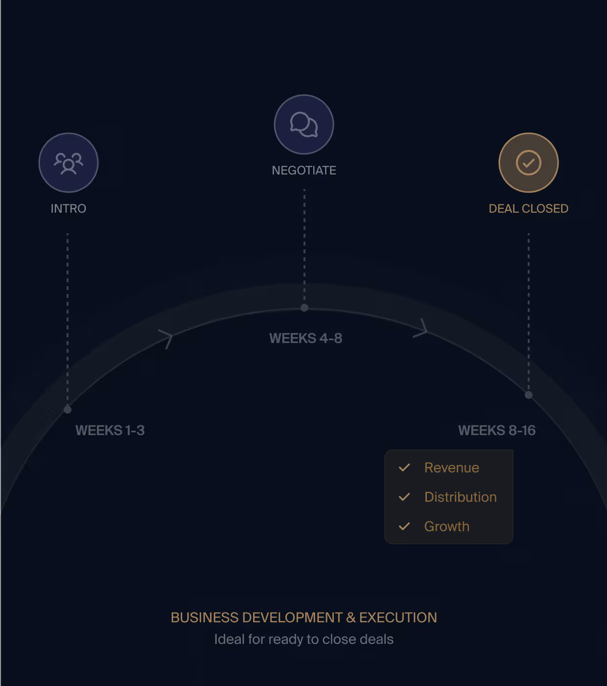 This is where strategy becomes revenue. We don't just make introductions and disappear. Weprovide active, ongoing business development services—creating strategic introductions, settingand attending meetings, facilitating partnership discussions, helping structure deals, negotiatingterms, and managing relationships through to signed agreements. We stay engaged untilpartnerships are delivering revenue, distribution, and measurable growth.